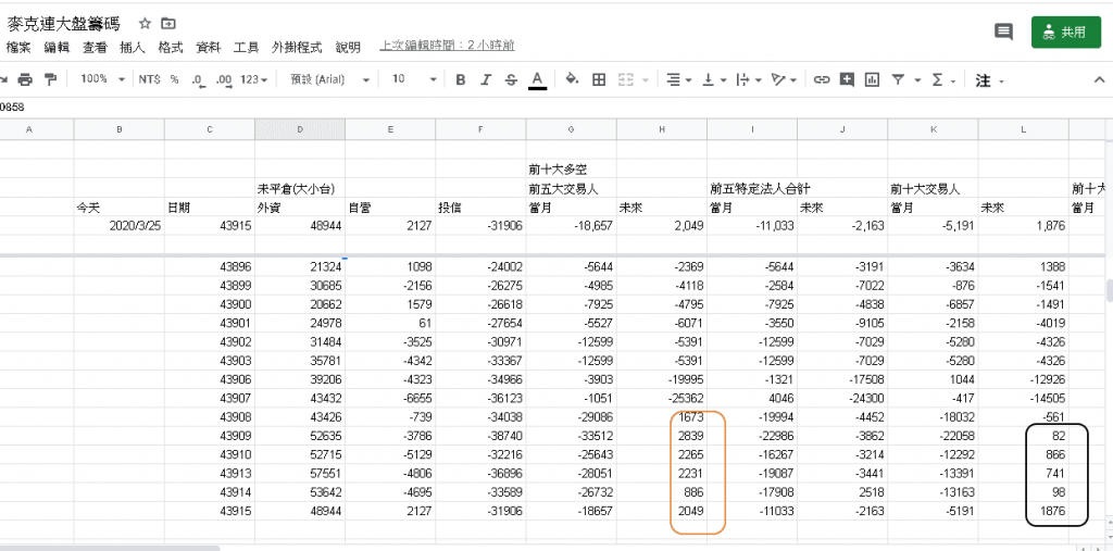 期貨部位,前五大已經超過連續一週多單,前十大也連五天,這樣出現一個可參考指標,當兩者連續三天以上多單,就有一個短期底部的假設。