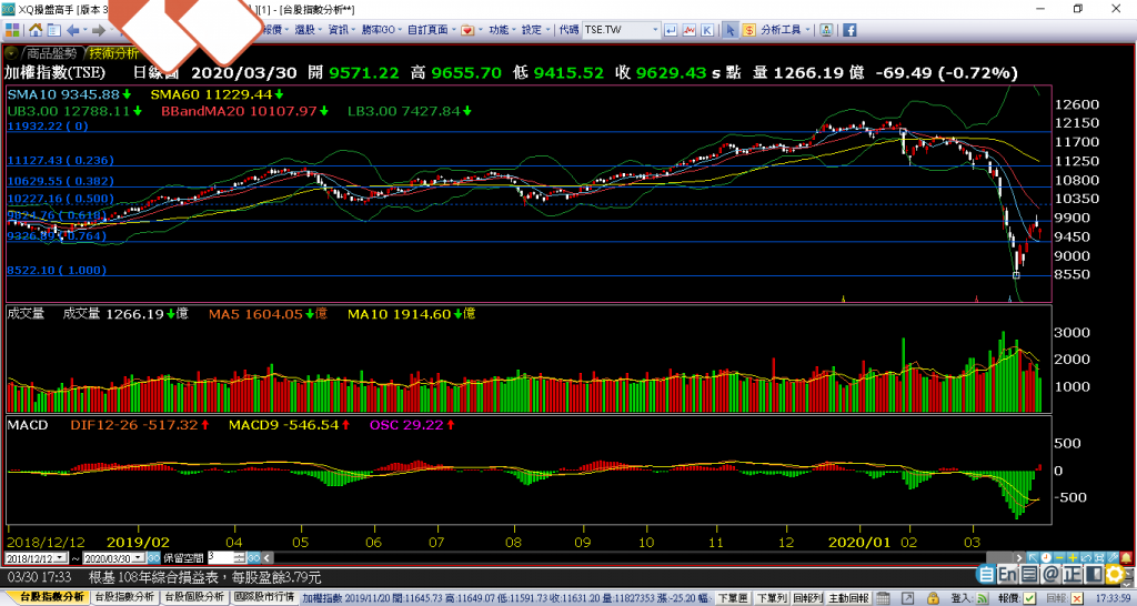 本日重點,從開低走高,收9629,多方短期宣告這裡是支撐區,MACD紅柱三天,上漲的成交量不大,以K線力道來說,不夠有力,多單策略維持不變,靜靜等待進場點。