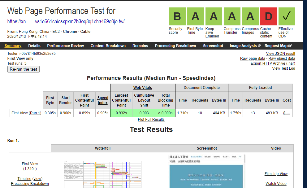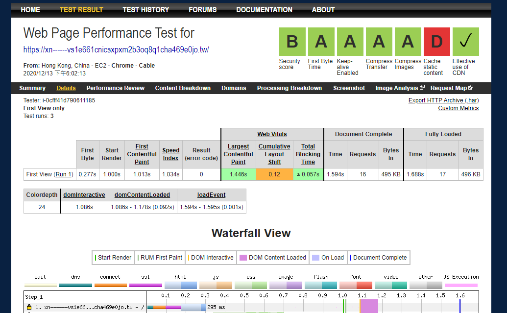 這次跑出來的分數就接近雲端主機的評分,但檔案又從400多K跳上去500K,JS檔案變大,但跑著更快,但這樣設定已經比之前在siteground更上一層樓。