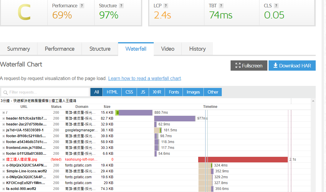 接著看一下,其他顯示的檔案大小,大多是 font、CSS、JS,會拖累一些時間,要想法子縮小,或是優化。