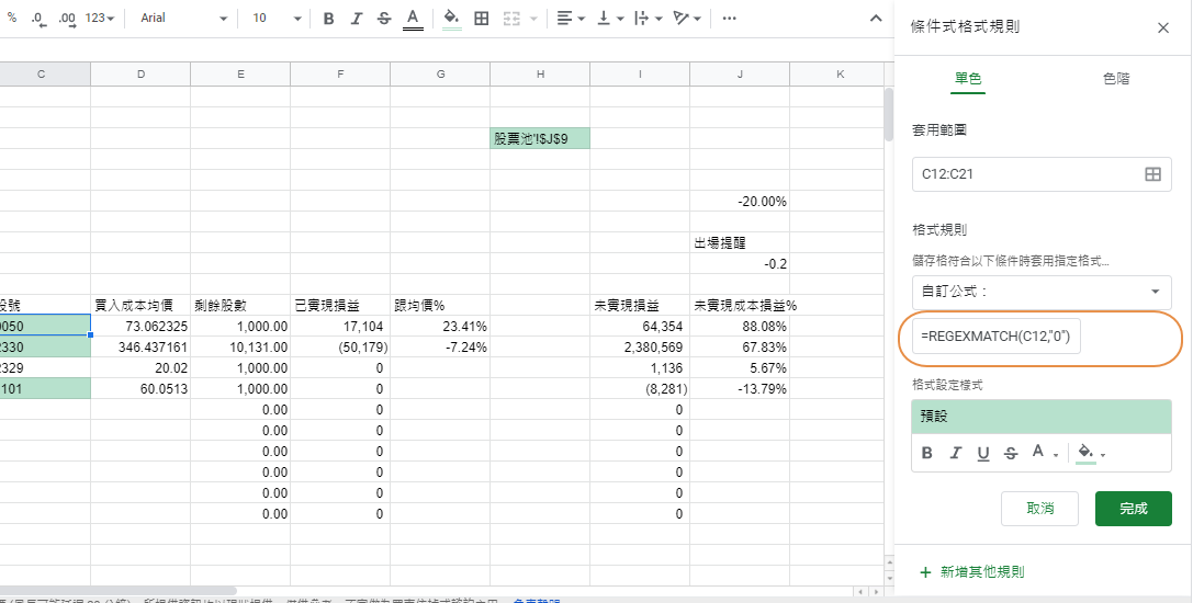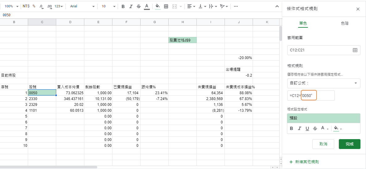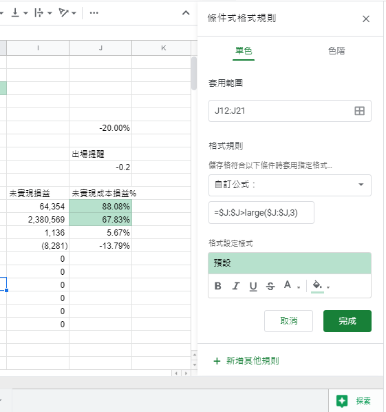 Google sheet,可用顏色區分條件,讓資料圖表更好閱讀,可簡單套用定值,或是使用儲存格值,或是套用公式,快速幫你找到重點,股票投資學習新手,推薦基本教學